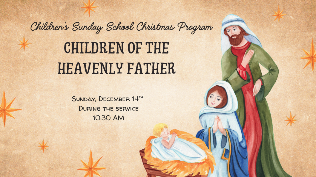 Our Sunday School kids invite you to their Christmas program, “Children of the Heavenly Father”, at the Sunday morning service this coming Sunday, December 14th. This year’s program reminds us how Jesus came at Christmas so we could become God’s children. The kids have been working hard on their songs and presentation, and can’t wait to share it with you! So invite your friends and family, and come celebrate God’s gift with us!