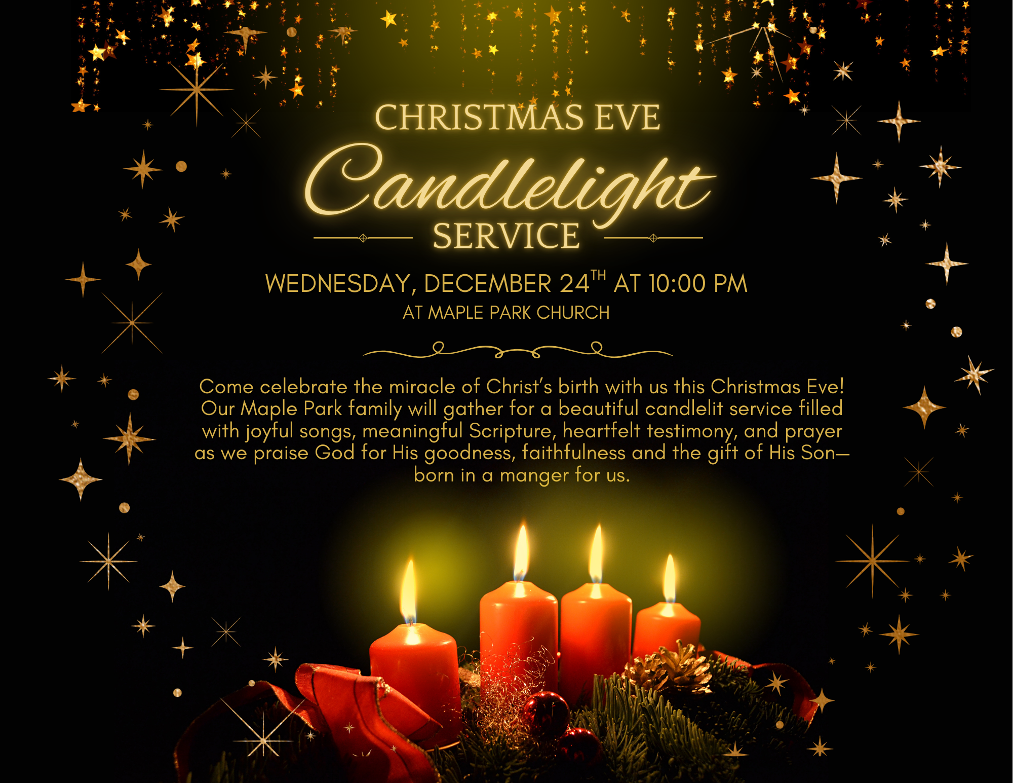 Come celebrate the miracle of Christ’s birth with us this Christmas Eve! On Wednesday, December 24 at 10:00 PM, our Maple Park family will gather for a beautiful candlelit service filled with joyful songs, meaningful Scripture, heartfelt testimony, and prayer as we praise God for His goodness, faithfulness and the gift of His Son—born in a manger for us.