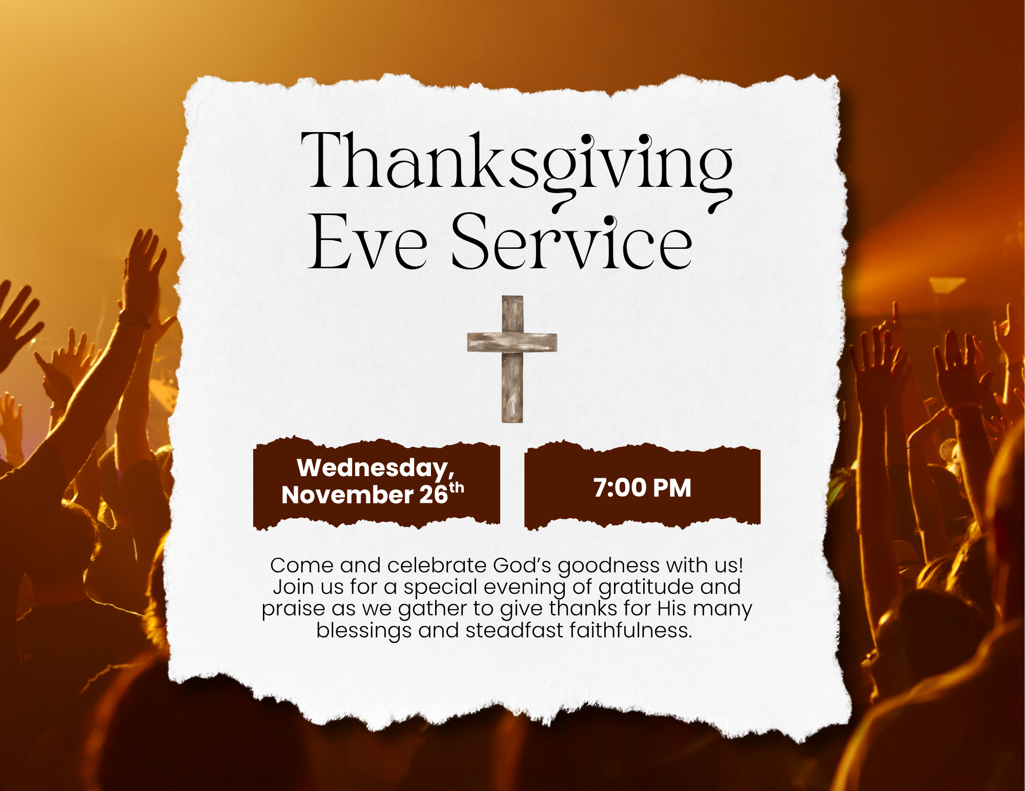 Come and celebrate God’s goodness with us! Join us for a special evening of gratitude and praise as we gather to give thanks for His many blessings and steadfast faithfulness.